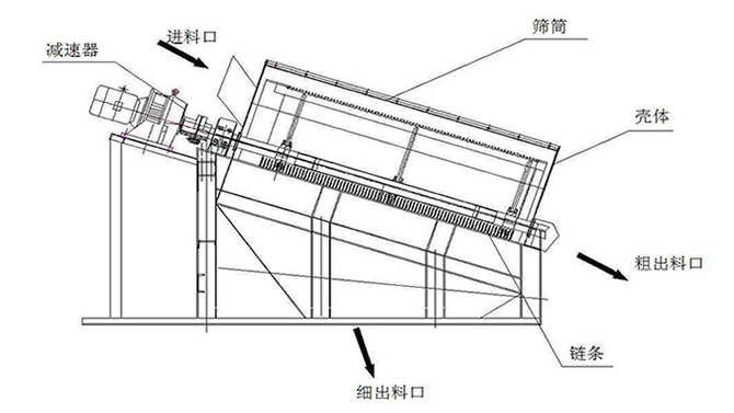 滾筒裝置傾斜安裝于機架上。電動機經(jīng)減速機與滾筒裝置通過聯(lián)軸器連接在一起,驅(qū)動滾筒裝置繞其軸線轉(zhuǎn)動。當(dāng)物料進入滾筒裝置后,由于滾筒裝置的傾斜與轉(zhuǎn)動,使篩面上的物料翻轉(zhuǎn)與滾動,使合格物料(篩下產(chǎn)品)經(jīng)滾筒后端底部的出料口排出,不合格的物料(篩上產(chǎn)品)經(jīng)滾筒尾部的排料口排出。由于物料在滾筒內(nèi)的翻轉(zhuǎn)、滾動,使卡在篩孔中的物料可被彈出,防止篩孔堵塞。滾筒篩砂機、滾筒篩分機與滾筒篩的原理構(gòu)造幾乎相同,是人們對它的認識和叫法上存在差異。
