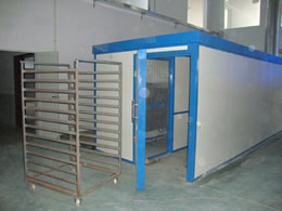 將待干燥的物料置于烘盤中,烘盤置于烘干車上,烘干車從干燥室入口依次進入,與此同時,熱風(fēng)由供風(fēng)系統(tǒng)從干燥室出干料端送入,與烘干車運行逆向,與物料進行充分的接觸。干燥室自動控溫,濕氣由排濕風(fēng)機自動排出。