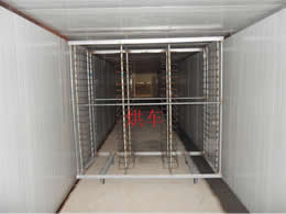 將待干燥的物料置于烘盤中,烘盤置于烘干車上,烘干車從干燥室入口依次進入,與此同時,熱風(fēng)由供風(fēng)系統(tǒng)從干燥室出干料端送入,與烘干車運行逆向,與物料進行充分的接觸。干燥室自動控溫,濕氣由排濕風(fēng)機自動排出。