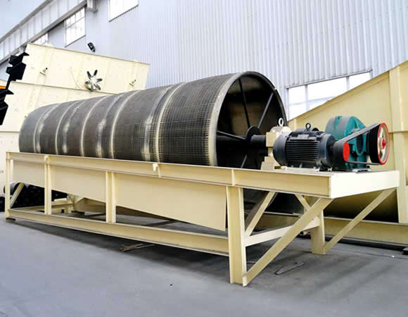 電機驅(qū)動滾筒軸線作旋轉(zhuǎn)運動,減速機調(diào)節(jié)筒體以一定的轉(zhuǎn)速旋轉(zhuǎn),物料由進料口進入筒體內(nèi),在旋轉(zhuǎn)產(chǎn)生的離心力作用下,物料在筒內(nèi)翻滾,自上而下通過分級篩網(wǎng)析出,由于篩網(wǎng)分級尺寸不同,物料逐漸被分離篩選,粒度合格的物料經(jīng)篩分后落入到各自的漏斗,然后由人力方式運出或通過輸送機自流送往成品站。合格產(chǎn)品經(jīng)過下端出料口排出,顆粒較大,分選不合格的產(chǎn)品經(jīng)另一排料口排出,筒內(nèi)清理裝置,使篩網(wǎng)不宜被阻塞。