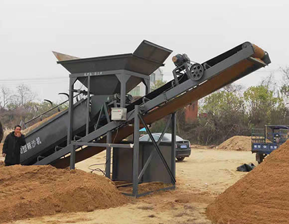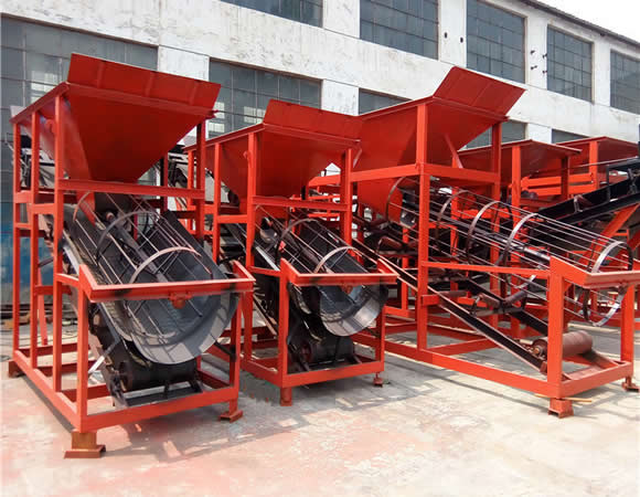 滾筒篩沙機是仿照人工利用斜面篩網(wǎng)篩砂的工作原理,采用平置滾篩筒,并保證料流在篩筒中的多圈內(nèi)螺旋葉片間可連續(xù)滾篩五圈以上,從而使砂料反復(fù)翻滾、滑動而充分離散、分離;滾筒式篩沙機不同于斜置滾篩引起的大小料相互推擠、埋壓,篩分過程匆忙;也不同于斜置滾篩或斜置振動篩所引起的大小料相互沖擠或大料托小料振跳而引起的篩分不干凈、混料現(xiàn)象。滾筒篩內(nèi)的打砂裝置,可對呈團砂塊打碎、打散。滾篩網(wǎng)面安裝的網(wǎng)面清理裝置可對粘附砂土自行清理以防堵塞網(wǎng)孔。